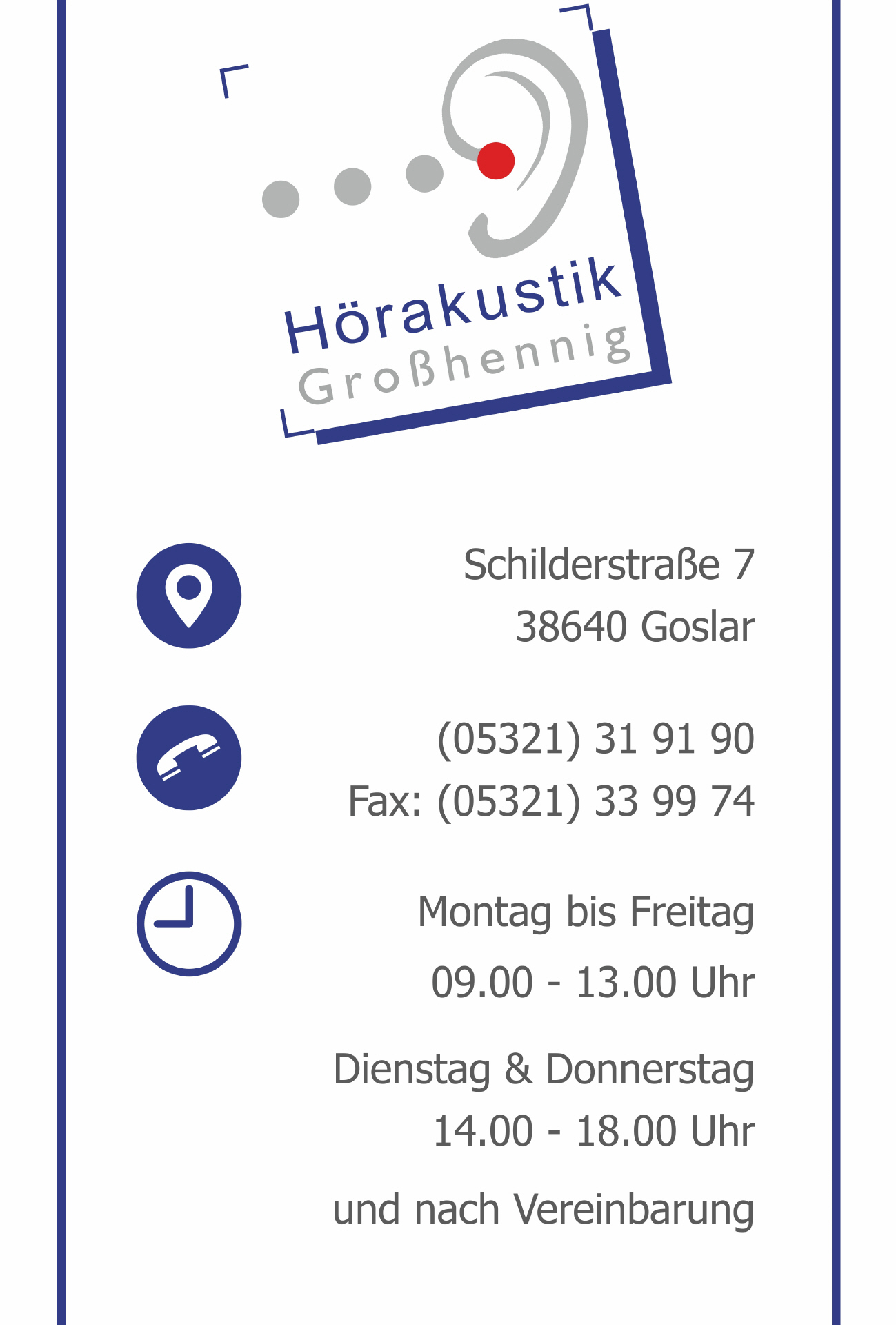 Herzlich Willkommen in unserem Meisterbetrieb "Hörakustik Großhennig" in Goslar. Inhabergeführt - und das seit 2001 - stehen wir mit unserer langjährigen Erfahrung für Individualität und Kompetenz in allen Fragen rund um gutes Hören.
